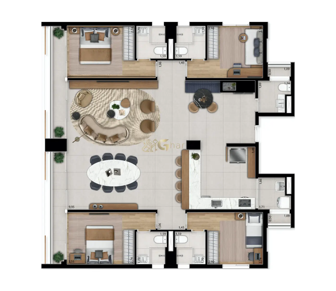 Todas as imagens têm caráter meramente ilustrativo e não constituem oferta de produto ou serviço. Em fotos de decorados, perspectivas artísticas e plantas com sugestão de decoração, os materiais efetivamente entregues seguem o memorial descritivo. Mobiliário, equipamentos, objetos de decoração, pisos, rodapés, louças, metais, molduras, forros, sancas e pontos de iluminação não integram o contrato de aquisição, salvo indicação expressa em documento comercial. Serviços de áreas comuns eventualmente citados dependem de deliberação em assembleia de condôminos. Os diferenciais mencionados podem não se aplicar a todas as unidades, ainda que de igual tipologia.