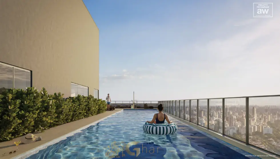 Espaços de lazer exclusivos no topo do edifício, como piscina, lounge, salão gourmet ou área de convivência, proporcionando vista privilegiada e ambiente sofisticado.
