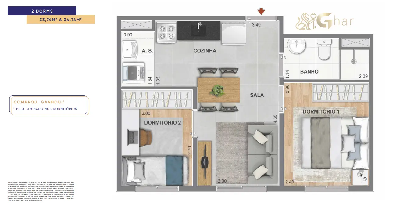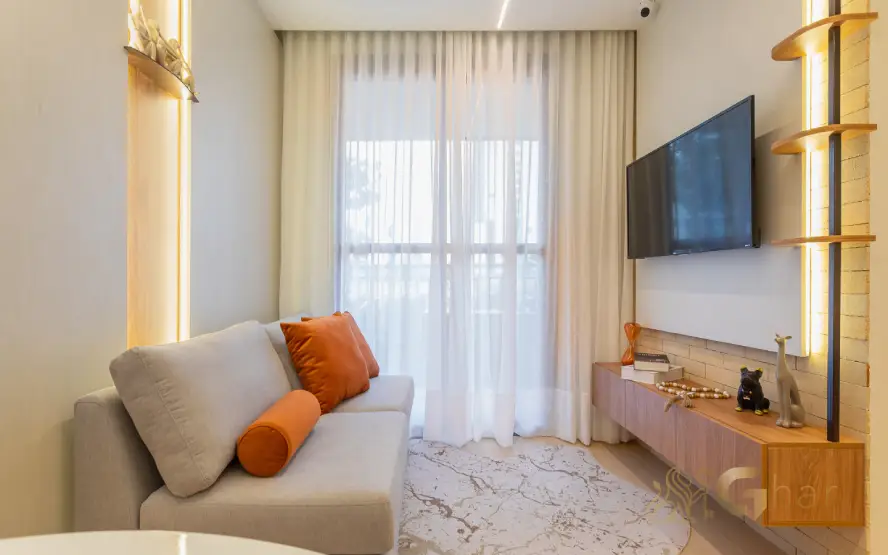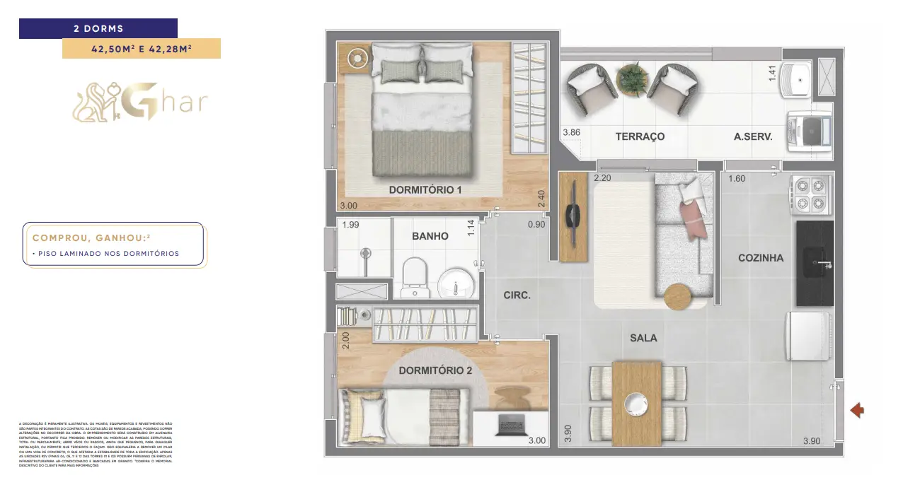 Todas as imagens têm caráter meramente ilustrativo e não constituem oferta de produto ou serviço. Em fotos de decorados, perspectivas artísticas e plantas com sugestão de decoração, os materiais efetivamente entregues seguem o memorial descritivo. Mobiliário, equipamentos, objetos de decoração, pisos, rodapés, louças, metais, molduras, forros, sancas e pontos de iluminação não integram o contrato de aquisição, salvo indicação expressa em documento comercial. Serviços de áreas comuns eventualmente citados dependem de deliberação em assembleia de condôminos. Os diferenciais mencionados podem não se aplicar a todas as unidades, ainda que de igual tipologia.