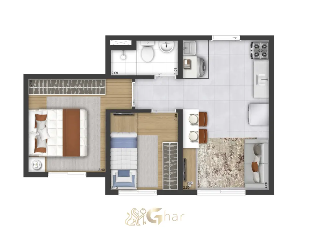 Todas as imagens têm caráter meramente ilustrativo e não constituem oferta de produto ou serviço. Em fotos de decorados, perspectivas artísticas e plantas com sugestão de decoração, os materiais efetivamente entregues seguem o memorial descritivo. Mobiliário, equipamentos, objetos de decoração, pisos, rodapés, louças, metais, molduras, forros, sancas e pontos de iluminação não integram o contrato de aquisição, salvo indicação expressa em documento comercial. Serviços de áreas comuns eventualmente citados dependem de deliberação em assembleia de condôminos. Os diferenciais mencionados podem não se aplicar a todas as unidades, ainda que de igual tipologia.