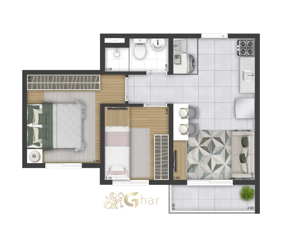 Com opções de 1 e 2 dormitórios, as plantas valorizam a integração dos ambientes, a entrada de luz natural e a funcionalidade dos cômodos, tornando o imóvel mais confortável e fácil de mobiliar.