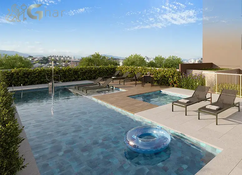 Espaços de lazer exclusivos no topo do edifício, como piscina, lounge, salão gourmet ou área de convivência, proporcionando vista privilegiada e ambiente sofisticado.