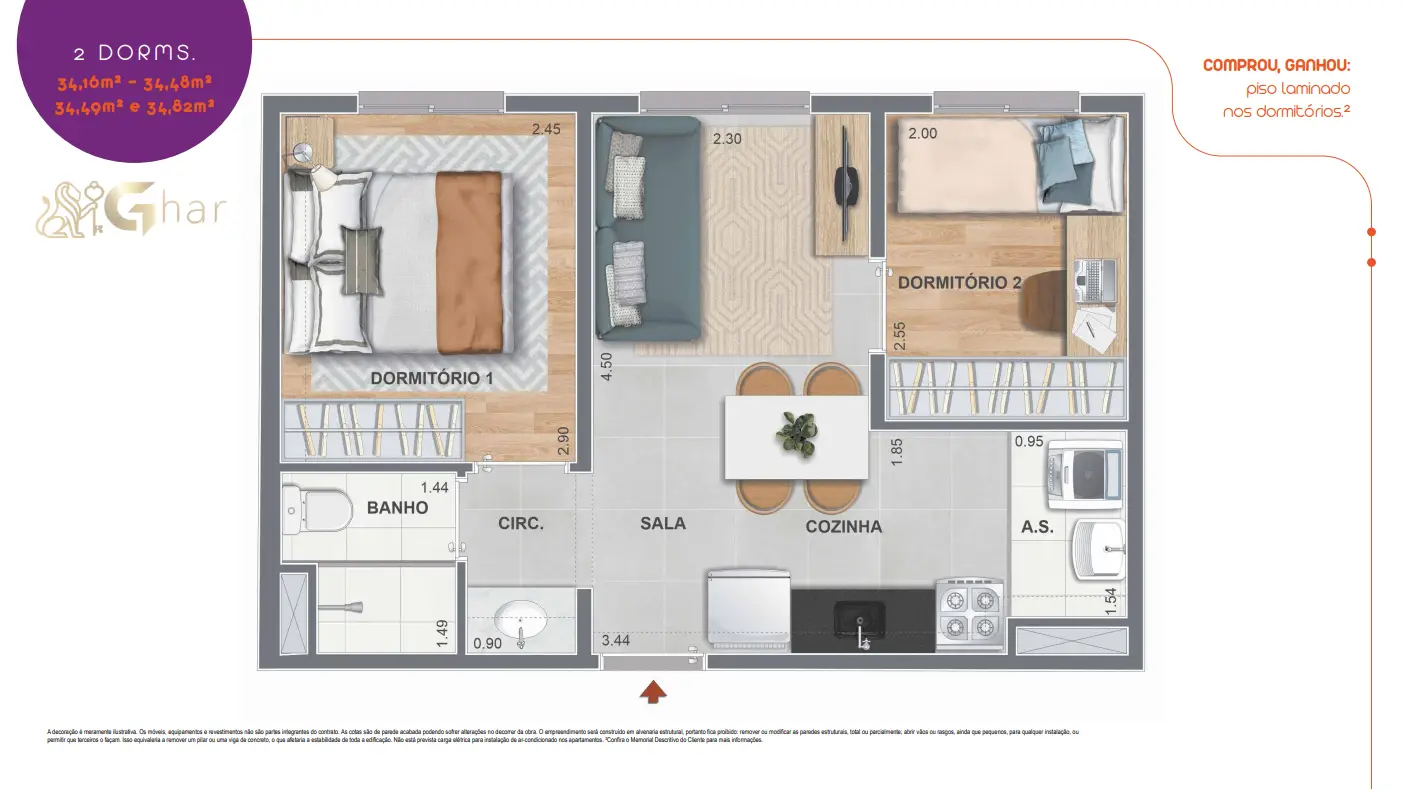 Os apartamentos do Nord Residencial São Miguel possuem metragens entre 34 e 37 m², com plantas bem distribuídas de 1 e 2 dormitórios e 1 banheiro.