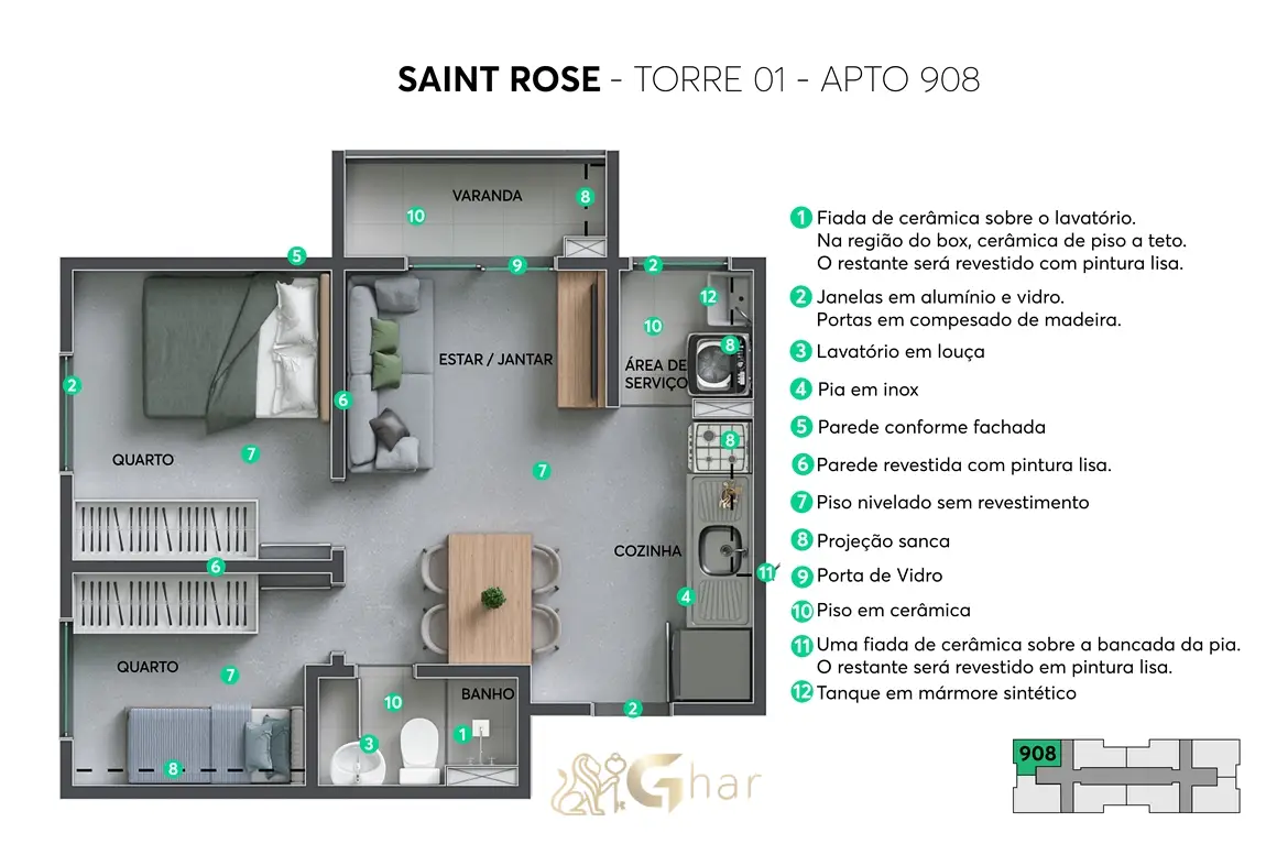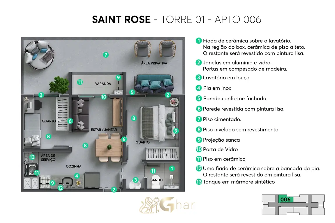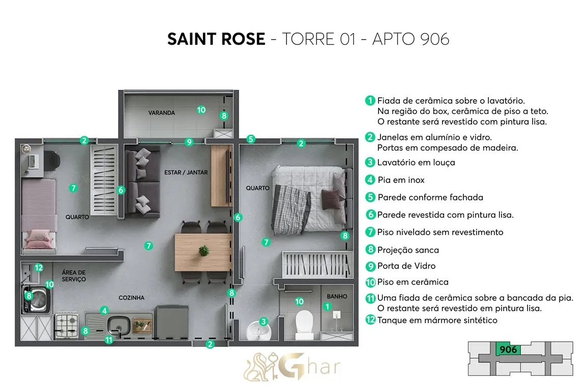 Os apartamentos do Saint Rose oferecem ambientes bem planejados, com 2 quartos, varanda, boa ventilação e iluminação natural. As plantas foram desenhadas para proporcionar mais conforto no dia a dia, mesmo em metragens compactas, garantindo funcionalidade e praticidade para toda a família.