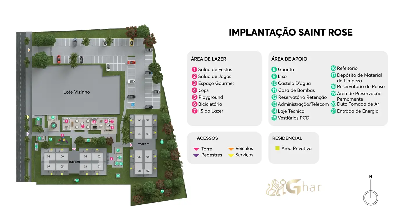 Além dos apartamentos, o Saint Rose oferece uma área de lazer completa, com playground, salão de festas, espaço gourmet, salão de jogos e bicicletário, criando um ambiente perfeito para o convívio familiar e momentos de descanso.