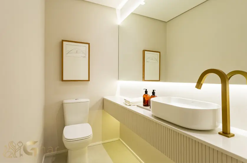 Banheiro de apoio elegante e funcional para atender visitantes, preservando a privacidade da área íntima da residência.