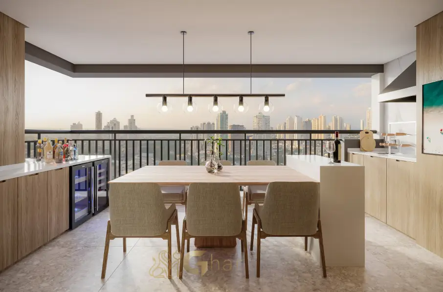 Varanda espaçosa equipada com infraestrutura para churrasqueira, grill ou cooktop, perfeita para momentos de lazer e confraternização.