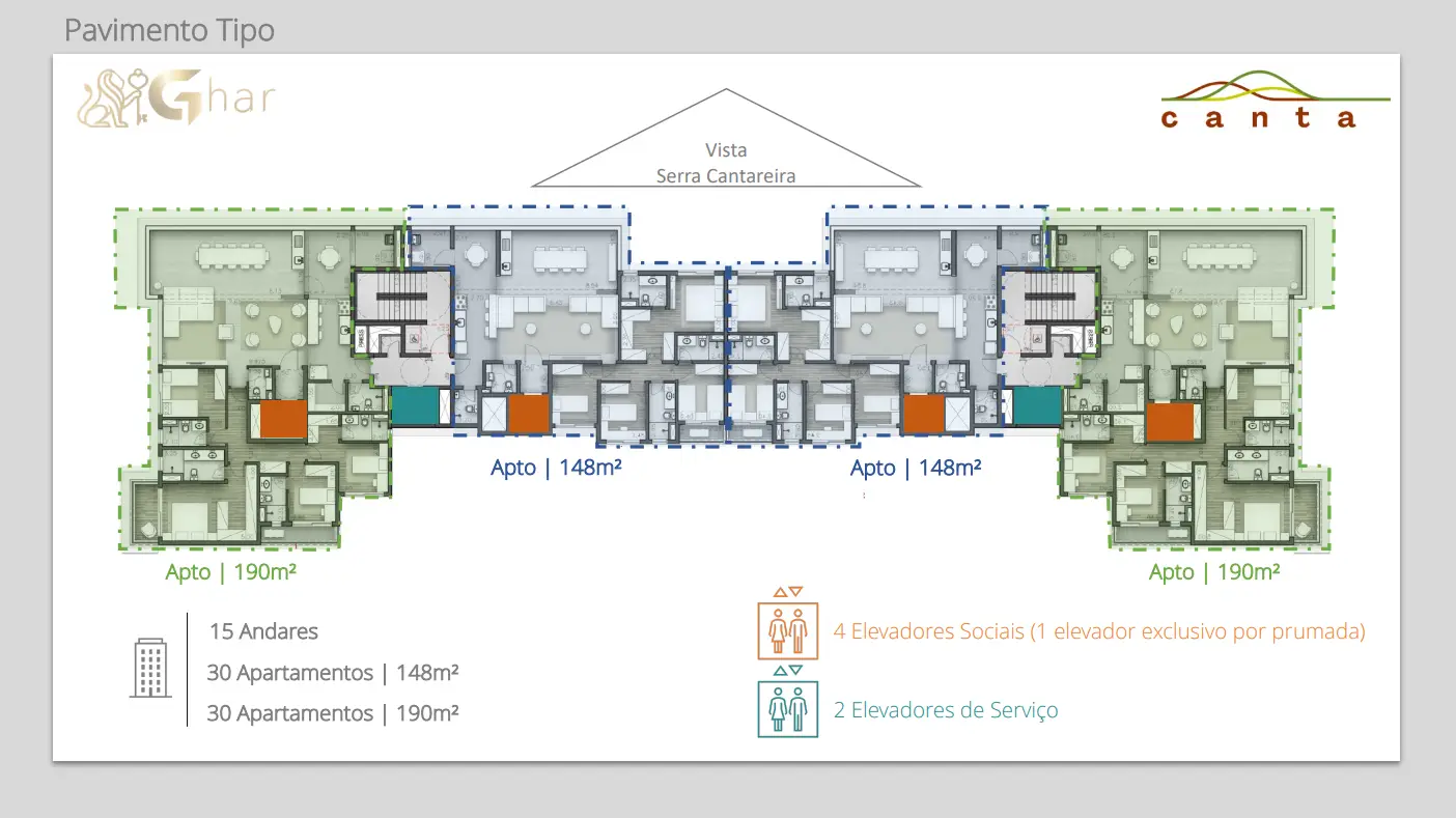 Os apartamentos do Canta Nova Cantareira possuem metragens que variam entre 148 m² e 190 m², com opções de 3 e 4 suítes, além de 2 a 3 vagas de garagem.