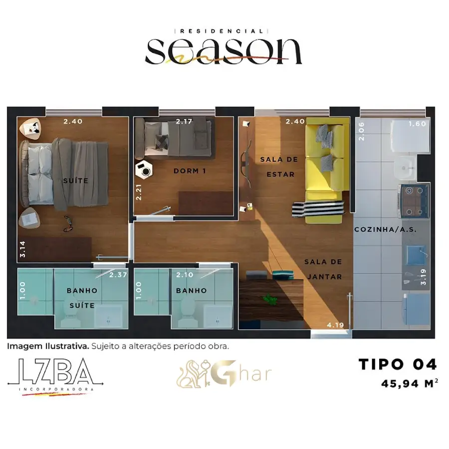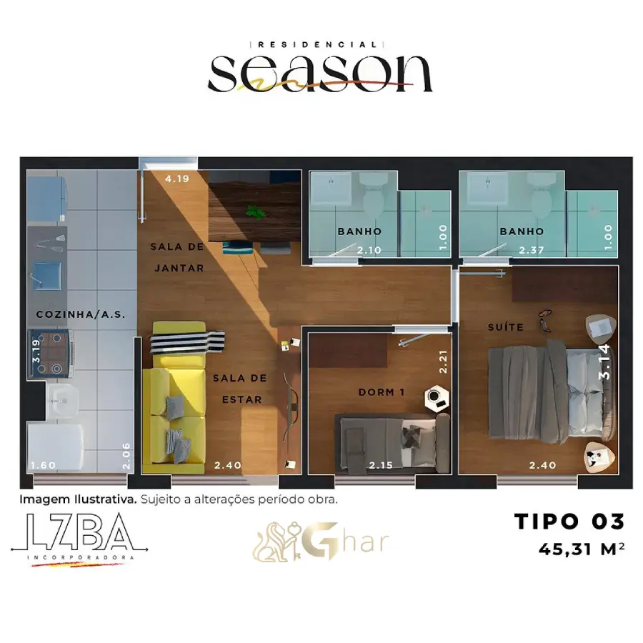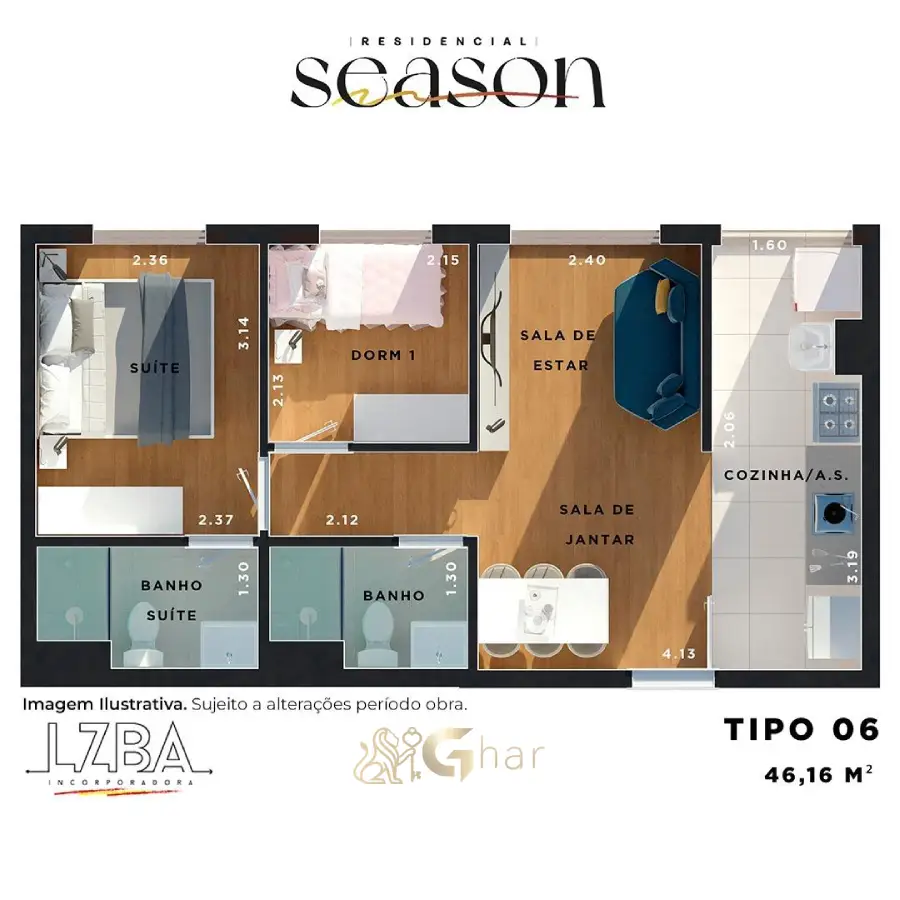 Os apartamentos do Residencial Season possuem metragens que variam entre 34m² e 52m², com opções de 2 dormitórios, com ou sem suíte, além de unidades com vaga de garagem.