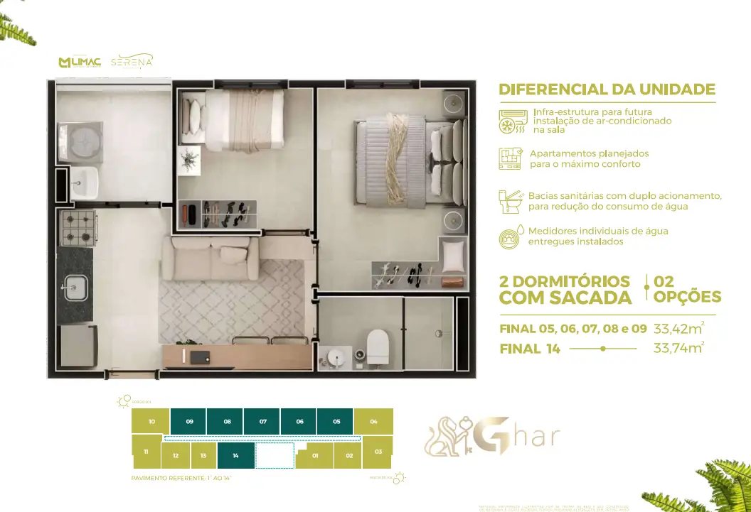 Todas as imagens têm caráter meramente ilustrativo e não constituem oferta de produto ou serviço. Em fotos de decorados, perspectivas artísticas e plantas com sugestão de decoração, os materiais efetivamente entregues seguem o memorial descritivo. Mobiliário, equipamentos, objetos de decoração, pisos, rodapés, louças, metais, molduras, forros, sancas e pontos de iluminação não integram o contrato de aquisição, salvo indicação expressa em documento comercial. Serviços de áreas comuns eventualmente citados dependem de deliberação em assembleia de condôminos. Os diferenciais mencionados podem não se aplicar a todas as unidades, ainda que de igual tipologia.