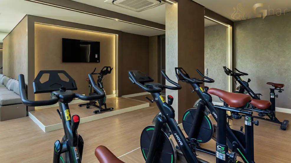 Estacionamento interno exclusivo para bicicletas, equipado com suportes e, em alguns casos, estação de manutenção, incentivando a mobilidade sustentável e saudável.