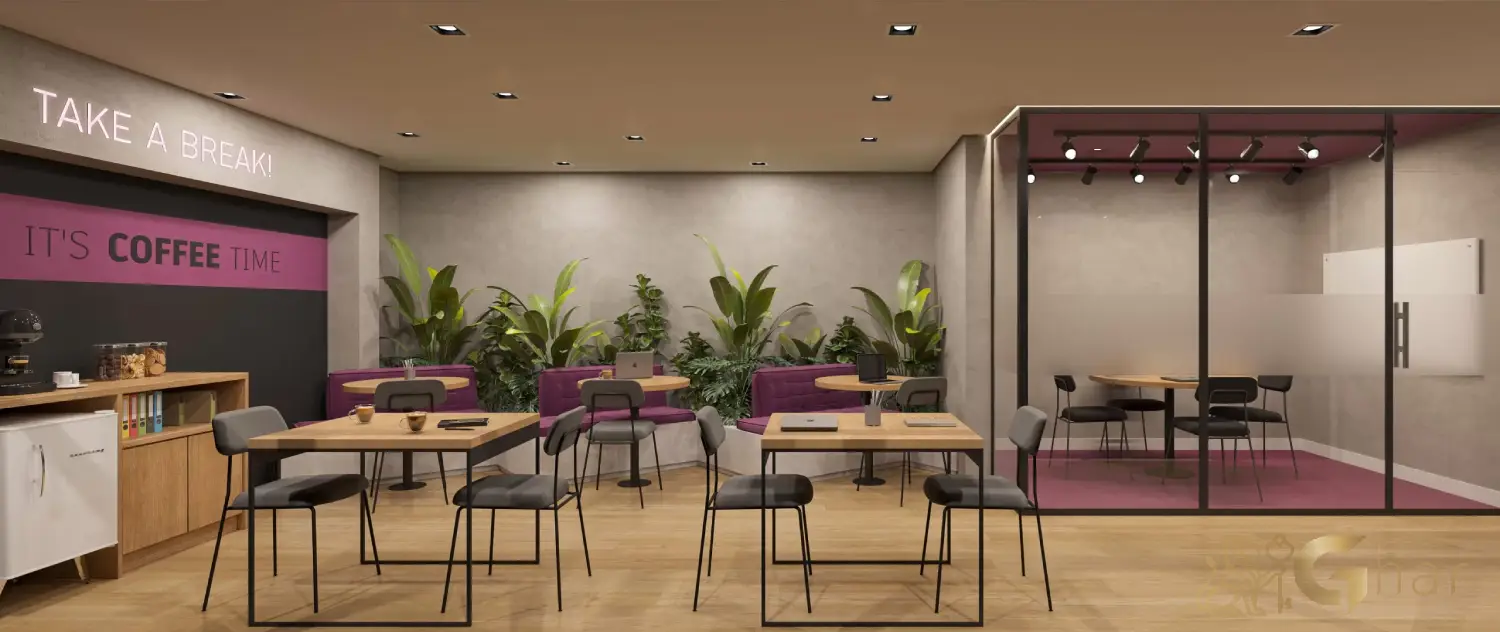 Ambiente equipado para trabalho remoto, com mesas, cadeiras ergonômicas, internet de alta velocidade e tomadas, ideal para reuniões e atividades profissionais.