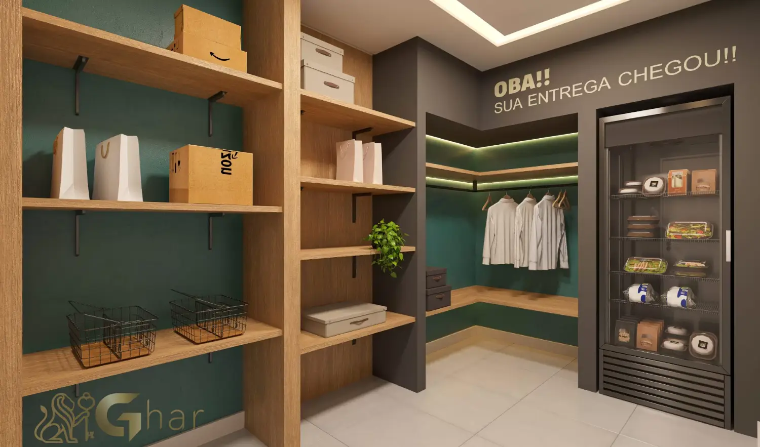 Área preparada para receber e armazenar entregas de encomendas, compras e refeições, mesmo quando o morador não está em casa. Garante segurança, comodidade e preservação dos itens até a retirada.