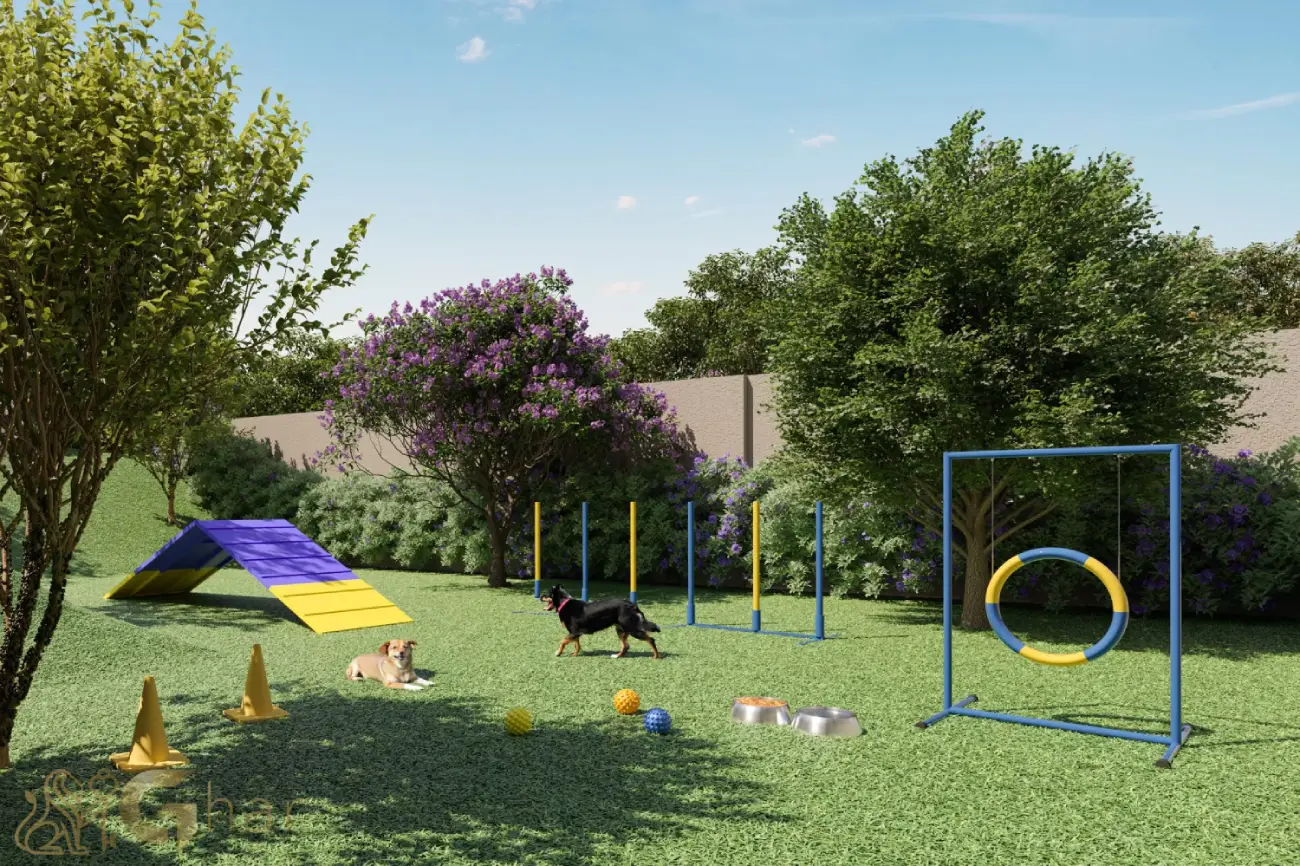 Área dedicada para cães e gatos, equipada com brinquedos, pistas de agility e espaços para socialização dos pets com segurança e comodidade.
