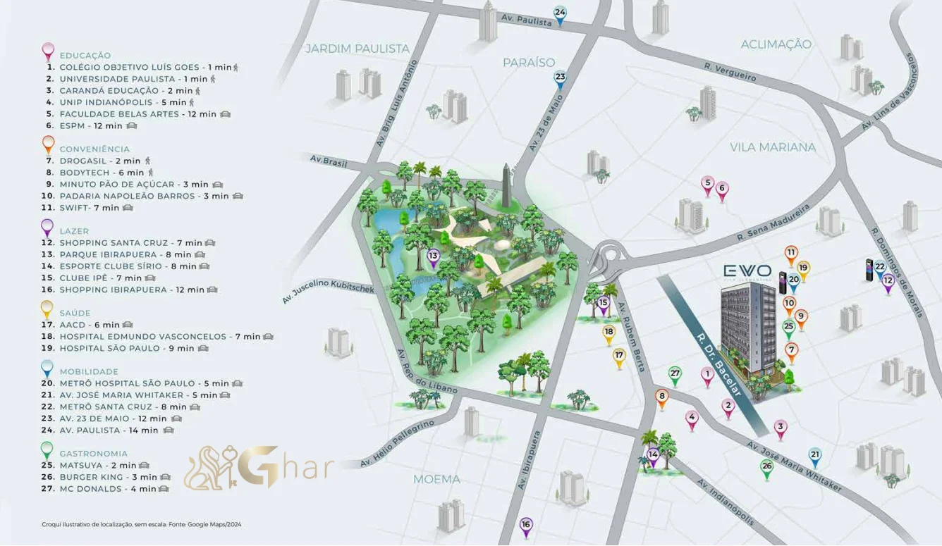 O empreendimento fica a apenas 5 minutos do Metrô Hospital São Paulo e próximo a pontos estratégicos como o Parque Ibirapuera, AACD, Shopping Santa Cruz e universidades como a Unip e a ESPM. A localização oferece uma combinação única de mobilidade, conveniência e qualidade de vida.