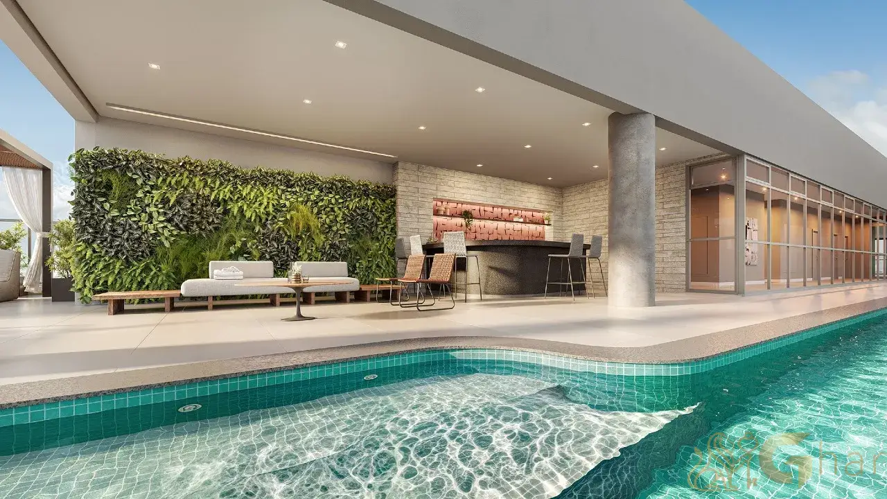A infraestrutura do condomínio inclui coworking, lavanderia coletiva, pet care, fitness center, sky bar, piscina com raia e deck molhado no rooftop, além de espaços de convivência como lounge externo, salão gourmet e churrasqueira com forno de pizza.
