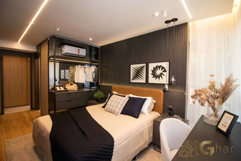 Suíte principal com espaço dedicado para closet, ideal para organizar roupas, calçados e acessórios de forma prática e elegante.