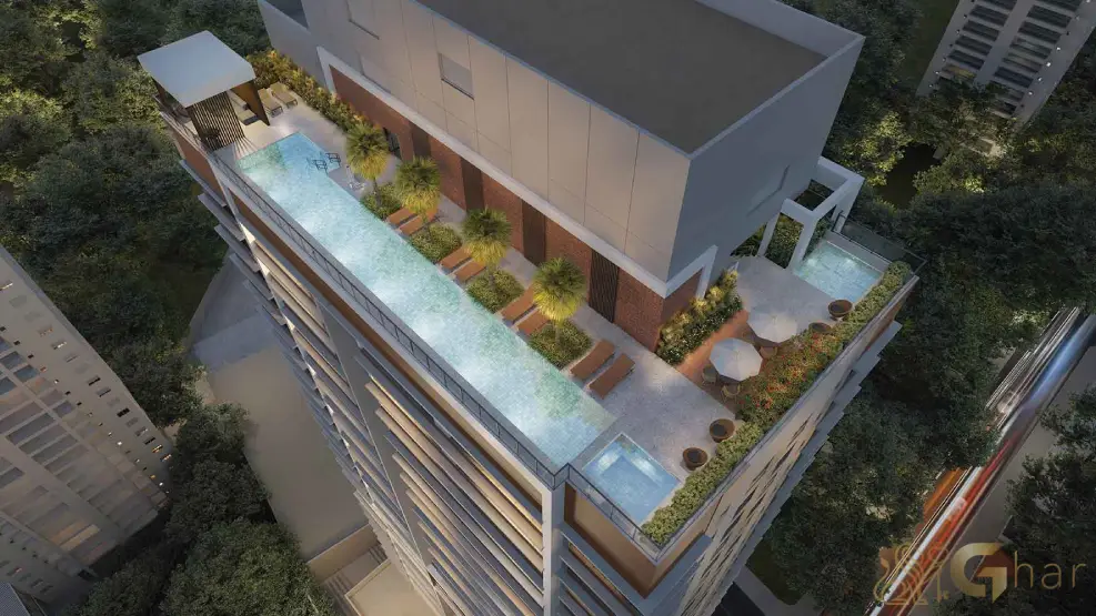 Espaços de lazer exclusivos no topo do edifício, como piscina, lounge, salão gourmet ou área de convivência, proporcionando vista privilegiada e ambiente sofisticado.