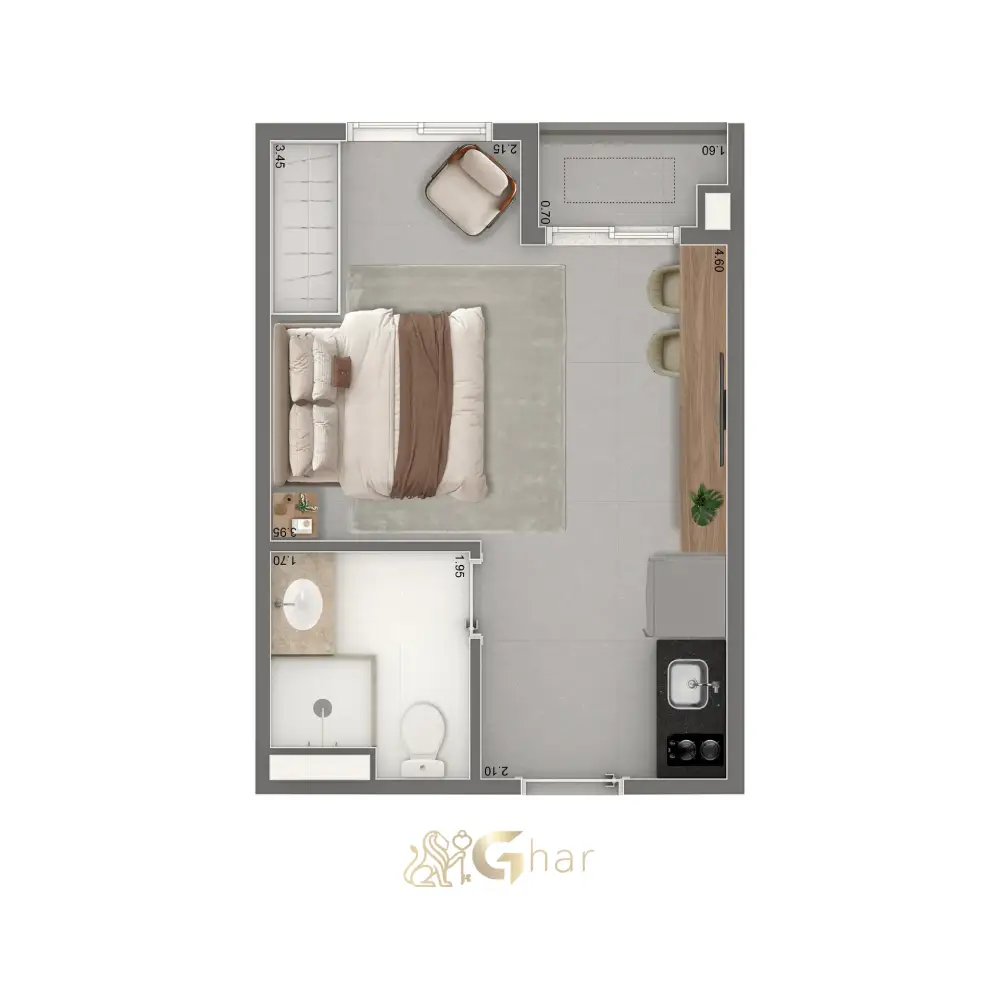 Os apartamentos do The Palace Apartments possuem metragens entre 23 m² e 30 m², disponíveis nas configurações de studio e 1 dormitório. As plantas contam com ambientes integrados, banheiro completo, cozinha funcional e layouts projetados para oferecer praticidade, conforto e ótima otimização de espaço.