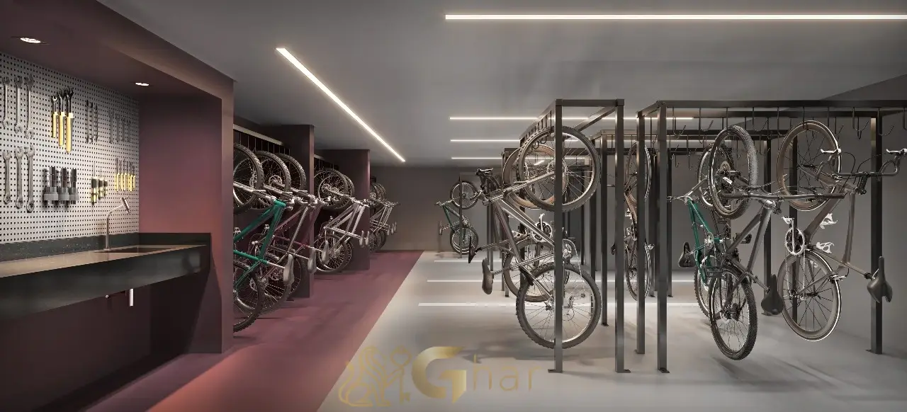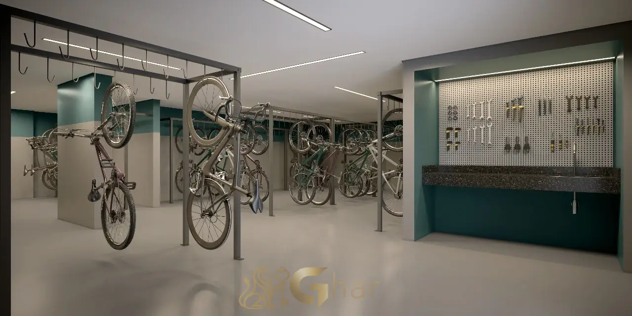 Estacionamento interno exclusivo para bicicletas, equipado com suportes e, em alguns casos, estação de manutenção, incentivando a mobilidade sustentável e saudável.