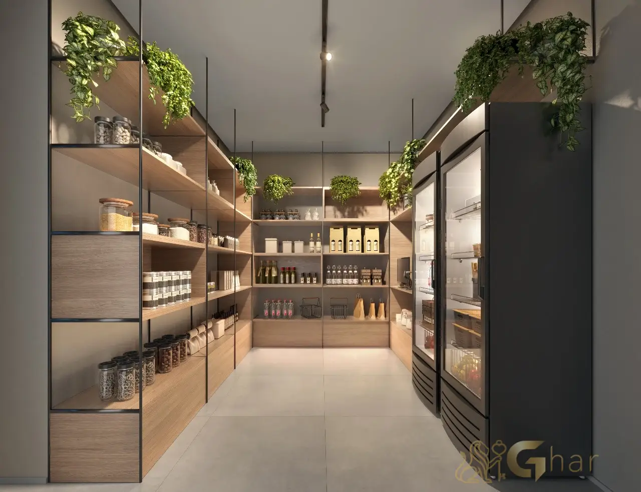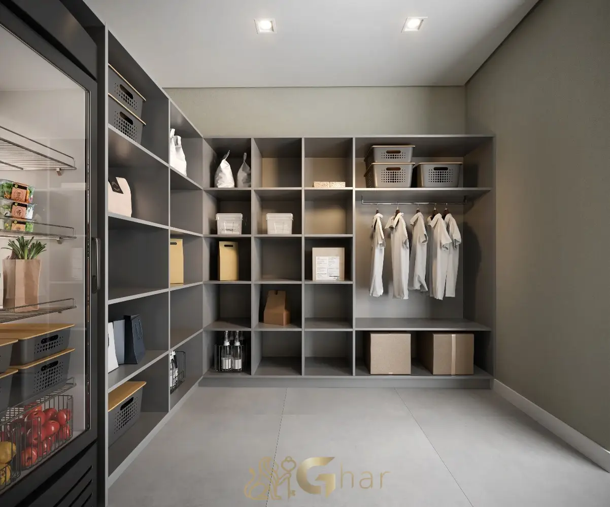 Espaço reservado próximo à cozinha ou área de serviço, perfeito para armazenar mantimentos, utensílios e produtos de limpeza, mantendo tudo organizado e acessível.