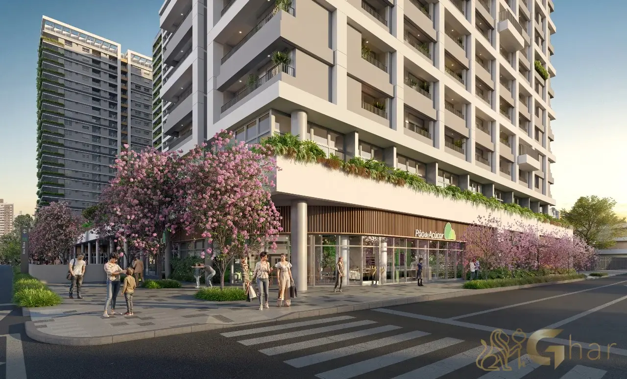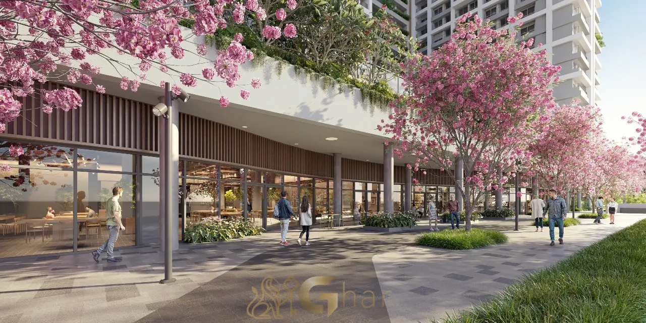 Fachada ativa com lojas e serviços integrados ao empreendimento, proporcionando conveniência e praticidade no dia a dia dos moradores.