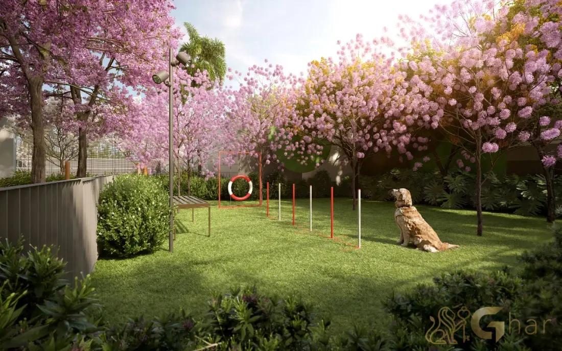 Área dedicada para cães e gatos, equipada com brinquedos, pistas de agility e espaços para socialização dos pets com segurança e comodidade.