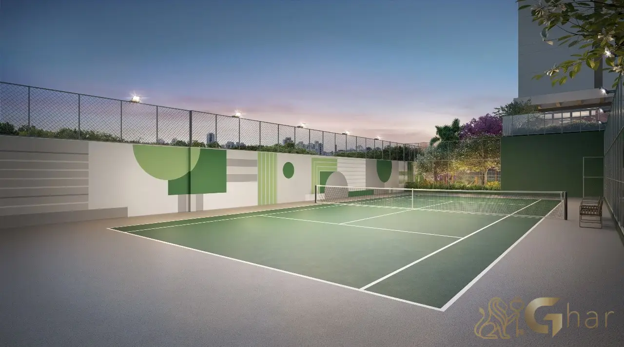 Entre seus diferenciais estão piscinas coberta e descoberta com raia, quadra oficial de tênis, coworking, wine bar, salão de festas, SPA, espaço pet e fitness center com vista panorâmica.