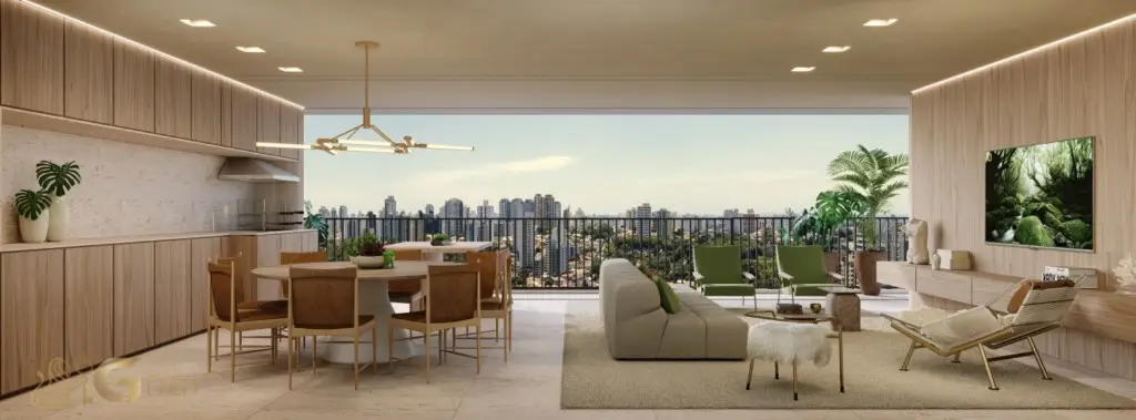 Sala de estar, jantar e terraço integrados em um espaço amplo e versátil, ideal para receber amigos, reunir a família ou criar diferentes ambientes. O design favorece a convivência e a iluminação natural.